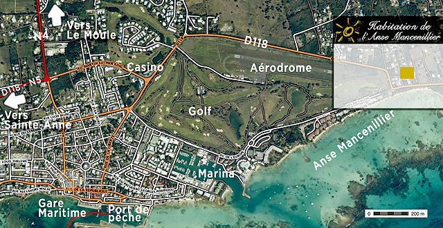 Au bout de l’aérodrome, après 2 grands virages vous passerez devant le restaurant « le Colombo » sur votre gauche. Continuez et prenez le premier chemin sur votre gauche (une pancarte indique notre villa). Conduisez une cinquantaine de mètres et vous y êtes !