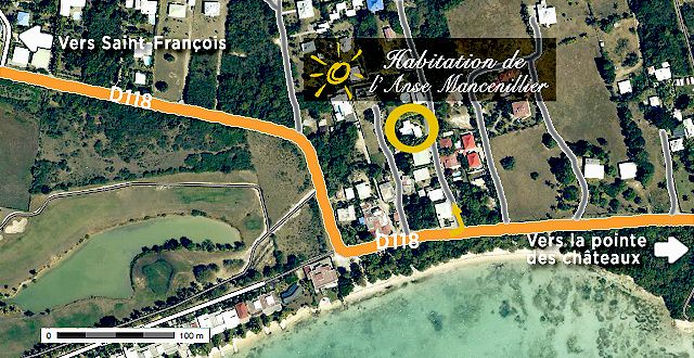 En arrivant à Saint-François, prenez la direction de la Pointe des châteaux. Puis Longez le golf et l’aérodrome.
